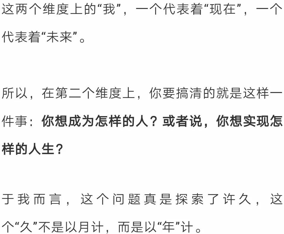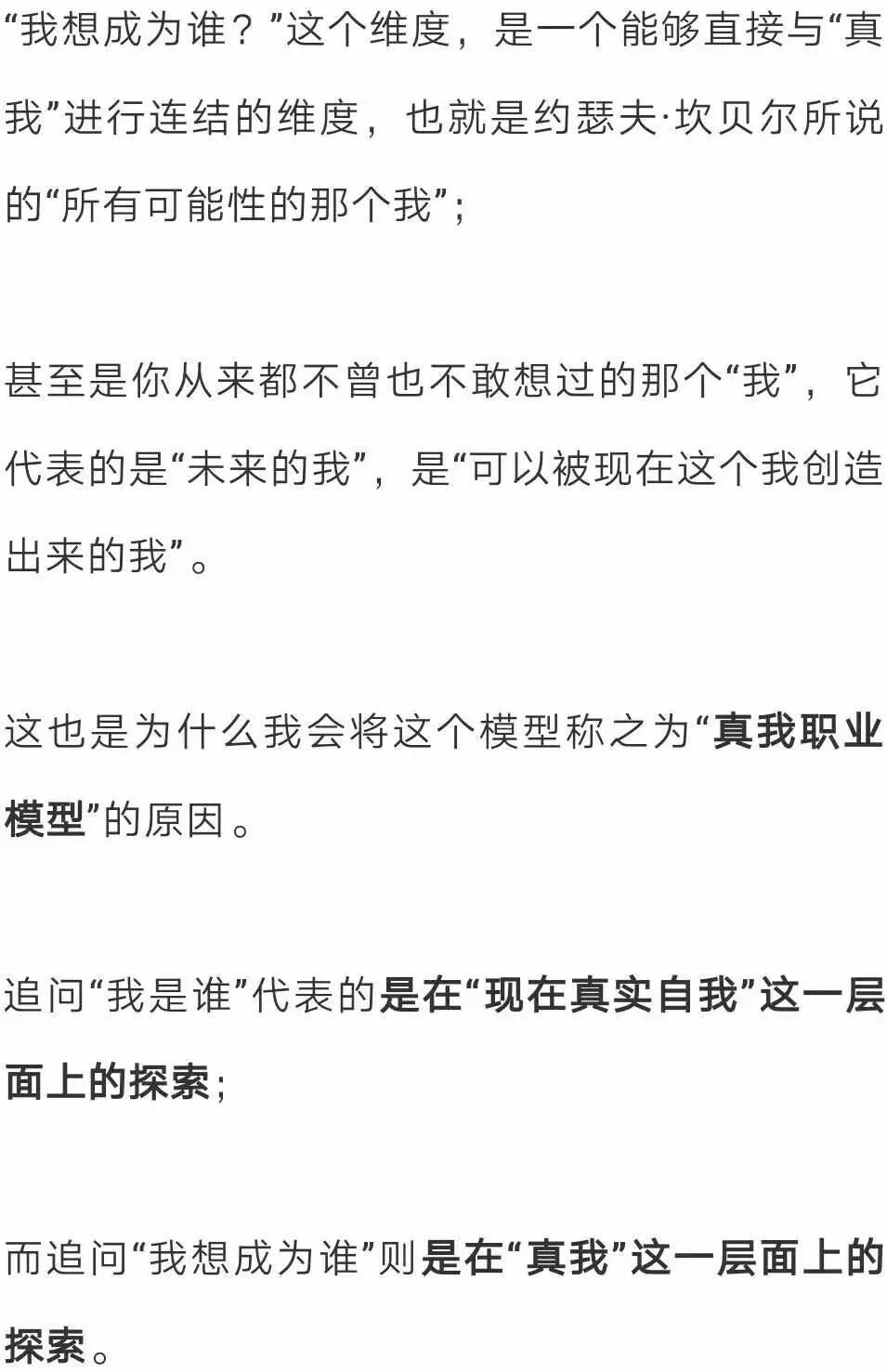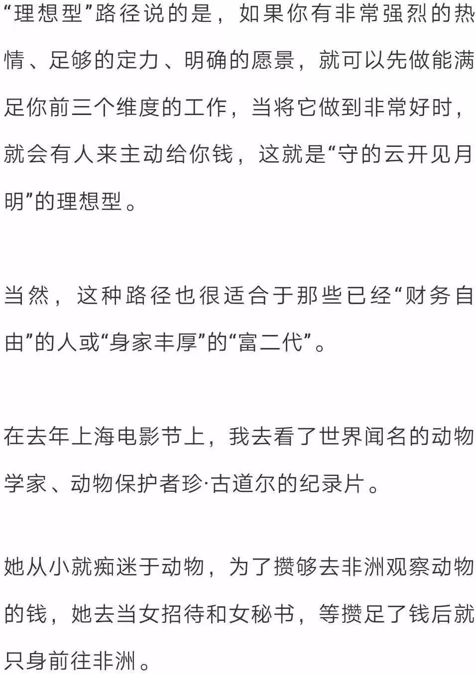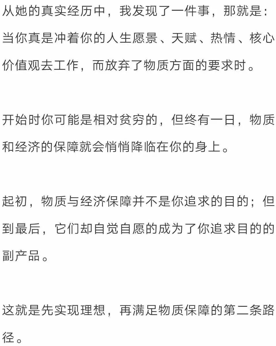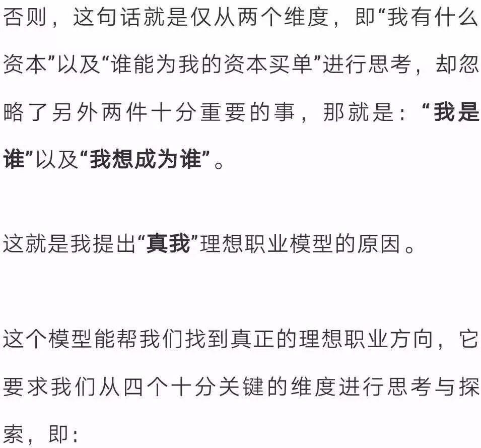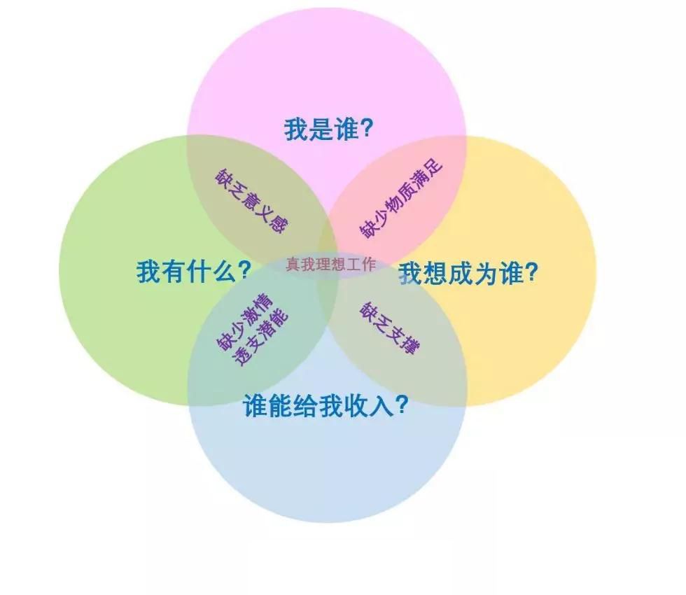 我是谁 我想成为谁 我有什么资本 谁能给我收入 而不仅仅是“我有什么资本”以及“谁能为我的资本买单”这两个维度。 第一个维度 - 我是谁? 想要回答这个问题,就要回答如下三个核心问题: 1)我的热情是什么? 2)我的天赋才干是什么? 3)我的核心价值观是什么? 以我自己举例: 1)我的热情是什么? 2)我的天赋才干是什么? 3)我的核心价值观是什么? 第二个维度 - 我想成为谁? 第三个维度 - 我有什么? “我有什么”这个问题是要去回答,我都拥有哪些资本。 一个人的学历、经历、工作经历、人脉、视野、见识、成功和失败,都代表着他的资本。 如果盘点一下我的资本(辞职前),就会发现,在市场营销领域、销售领域、培训领域、项目管理领域、写作、创意等方面,我都拥有比较丰富的经验。 我的阅读涉猎很广,很多领域的书籍我都读过,这就让我拥有了比较跨界的思维方式。我的每一次旅行,都融入了我的血脉。 同时,我的所有经历,那些一次次的“巅峰时刻”以及一个个的“至暗时刻”,也都成为了我的资本,它们既给了我自信和勇气的来源,也给了我进行自我成长和自我疗愈的具体实践与真实体会。 第四个维度 - 谁能让我有收入? 在这个维度,要考虑就是谁会付钱给你?以及为什么付钱给你? 也许是因为你的学历,也许是因为你的热情,也许是因为的天赋,也有可能是因为你的阅历…… 而搞清这个维度的关键就在于:拥有敏锐的市场洞察力以及强大的思考能力。 从对以上三个维度的分析,可以看出,某些方向的职业,比如:我正在从事的Coach(专业教练)与写作(与自我认知和思维提升相关的),都是非常匹配的方向。 同时,如果再来看“谁能让我有收入?”这个维度,就会发现,这些方向上的需求其实也是欣欣向荣的,因为有太多人想要去改变自己的人生、实现生命的蜕变,或者想要彻底地疗愈自己。 于是,就成为了我在辞职之后,正在从事的事业。 看到这里,你肯定会说:即使我理解了这个模型,可还是无法一次性找到四个维度的交集,该怎么办呢? 这时,你的面前就一共摆着三种路。 路径一:齐头并进型 “齐头并进型”的路径意味着: 你得在工作时间努力工作、努力赚钱; 在业余时间去做能够满足第一和第二维度的事(即满足热情、天赋才干、核心价值观与愿景的事); 二者齐头并进,直到有一天时机成熟,你就可以获得理想的工作了。 比如:日本著名小说家村上春树就是这样做的。 他采用的职业发展路径就是典型的“齐头并进型”,整个过程用了不止三年。 在他意识到越来越需要整块时间来创作小说,同时也拥有了一定的经济保障和写作经验后,他出让了自己的店铺,甘心成为了一名收入锐减的职业小说家。 但后来,正如我们所知道的,他的天赋、热情与努力也的确回报了他,最终这份工作成为了四个维度上的交集所在。 路径二:理想型 路径三:渐进型 顾名思义,第一份工作,先找一个能够满足你收入、契合你资本的,等你的能力提升、积蓄增加时,就可以转换到另一个能够发挥你一定天赋才干和热情的工作; 然后,等你天赋才干被打磨得越来越好,资本积累得越来越多后,你就可以再次转换职业,找一个更加贴近你天赋、热情、价值观和人生愿景的工作,然后再继续提升能力。 直到有一天,你发现了那个能让你发挥出最大热情、天赋才干、核心价值观,能让你实现人生愿景,并满足经济要求的理想工作,四者的完美交集就算真正找到了。 美国总统里根就是这样做的: 他出生于一个贫困的白人家庭,16岁时为了15元的周薪,成为了一名救生队队员,一干就是7年。 因为救生员的收入,他得以自费进入了伊利诺伊州的尤雷卡学院,主修经济学和社会学。 读书的时候,他开始锻炼自己的演讲能力,因为他希望在毕业时能够成为一名电台播音员,后来他如愿以偿,因为运动员和演讲的双重背景,毕业后里根成为了电台里的体育解说员,负责芝加哥杯棒球赛的解说。 3年半后,一个机缘巧合,他发现了自己的表演天赋。因为表演天赋,演讲能力,以及好的体格,26岁的里根成为了一名演员。 从影三年,没有火起来,然后二战就爆发了,30岁的里根入伍,从事军方的教学影片录制, 后因军方与演艺圈的双重背景,他成为了电影演员协会的主席。 44岁时,他开始把目标转向传媒,当时的GE公司有一档很受欢迎的周播节目,因为演员的外形和演讲能力,里根被聘为主持人。 在这里,他接触到了商界政界的人物,获得了公众知名度。 55岁时,里根当选美国加州州长,连任两届,57岁时成为共和党候选人提名,失败,65岁再参与,再失败,69岁时第3次竞选党内候选人终于成功提名。 70岁时,里根成为了美国年龄最大的总统,连干两届一直到78岁卸任。 这就是第三种路径——渐进型。从里根开始做第一份工作,也就是16岁,到他找到自己最为理想的工作,也就是70岁,他走过了漫长的54年。 在这个过程中,他的资本是一点点积累起来的,他的天赋才干是一点点被发掘和激活的,但最终,他还是找到了四个维度上的交集,成为了美国总统。 幸好,里根在他工作之初,没有听信那句话 – 你必须在你所在领域不断积累,不能变换跑道,不然就会前功尽弃。 这就是我原创的“真我”理想职业模型以及实现它的三种路径。 伽达默尔曾说,世界上的路,都是通向自我认识的。 相反,如果是一条看不见自我的路,既看不见现在这个真实自我的渴求,也看不到未来