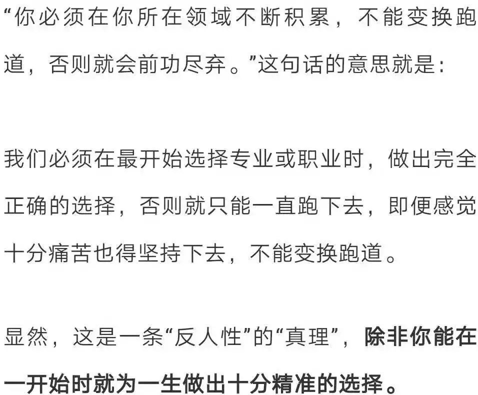 于是,很多职场人的烦恼便由此而生,因为他们正在做的工作并不是自己真正想要的,而他们又被告知不该变换跑道,一旦变换就会前功尽弃。